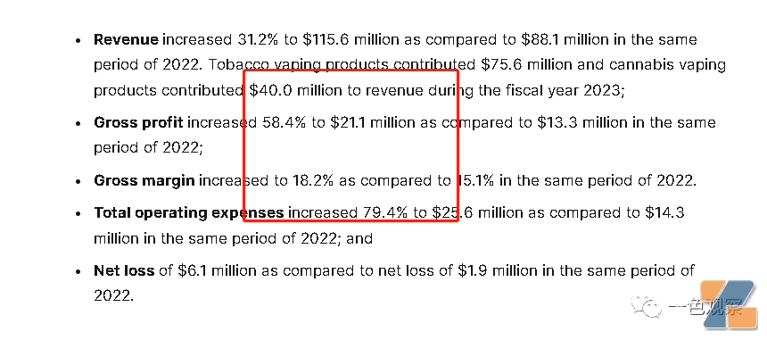 其今年5月发布的数据显示,截至2023年3月31日的2023年季度的财务营收同比增长26.9%,达到2410万美元;毛利润同比增长51.9%,达到450万美元。当时其电子烟产品为收入贡献了1650万美元,而CBD相关雾化产品为收入贡献了760万美元,电子烟收入占比到68%比重。