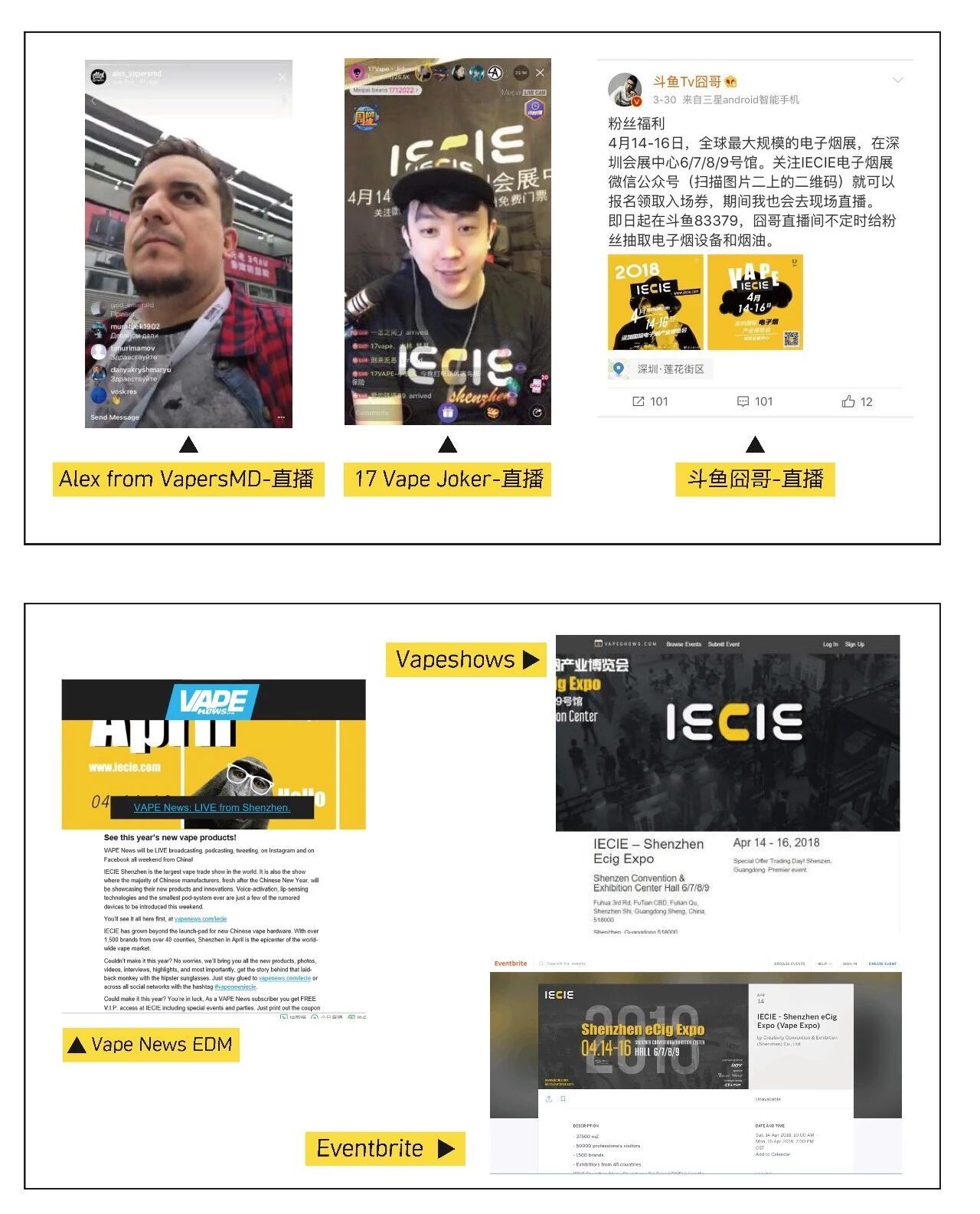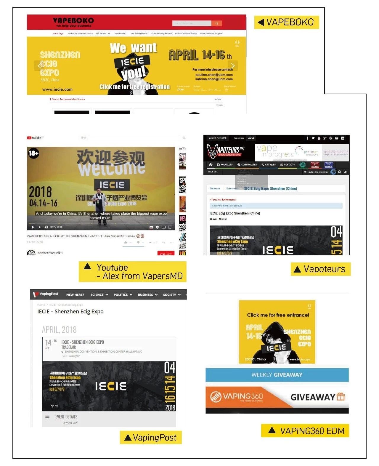 为了扩大展会和整个电子烟行业的影响力,以下是IECIE电子烟展为展会做的各项推广(部分展示)。接下来的每一届展会,IECIE都会尽心尽力、推陈出新的做好宣传推广的事宜。