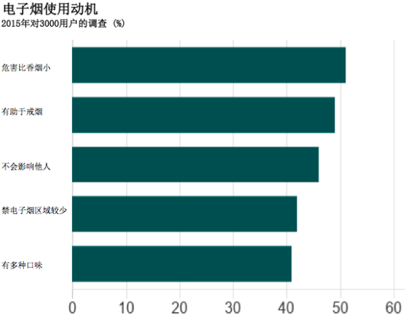 根据凯度为安永做的跨国调查显示,抽电子烟最常见的原因是因为“电子烟危害小于香烟”。