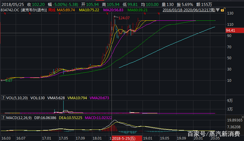 随着电子烟市场的不断增长,以及业绩不断爆发,麦克韦尔的股价也一路水涨船高。2018年5月,麦克韦尔成为新三板首个十倍股。