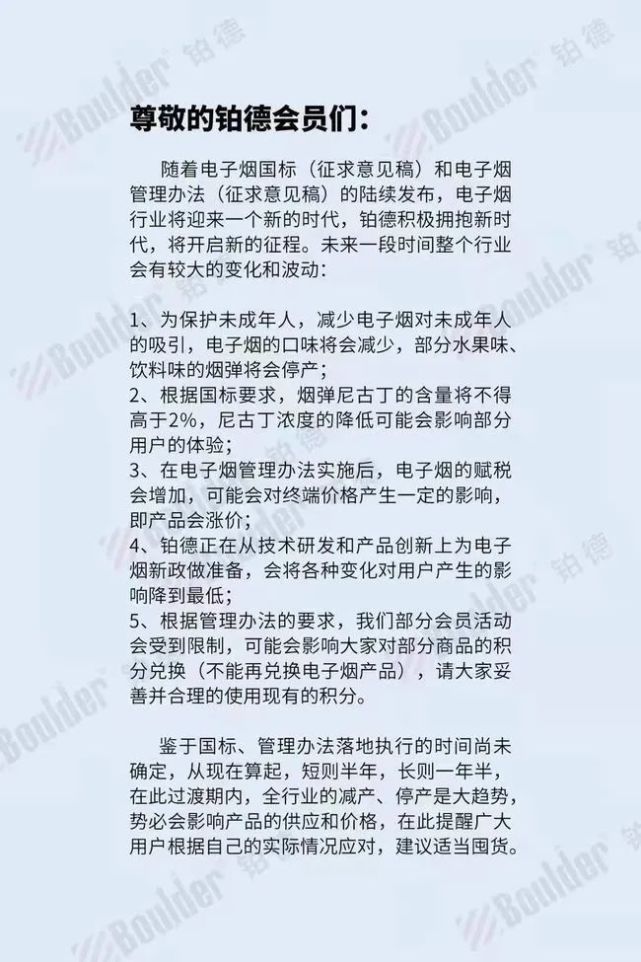 在铂德对会员公告中,表达了对口味烟弹停产的预期,铂德表示,随着电子烟国标(征求意见稿)和电子烟管理办法(征求意见稿)的陆续发布,电子烟口味将会减少,部分水果味、饮料味将会停产,电子烟行业将迎来一个新的时代,铂德积极拥抱新时代,将开启新的征程,未来一段时间整个行业会有较大的变化和波动,建议适当囤货。