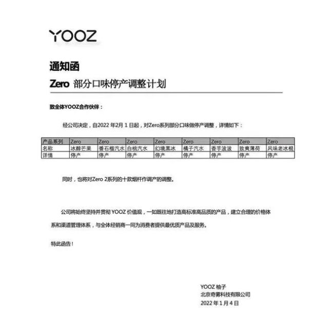 据ATOM tech消息,今日YOOZ柚子官方对外发布ZERO部分口味停产调整通知函,从今年2月1日起,YOOZ柚子将对Zero系列包括冰醇芒果、白桃汽水在内的9个口味进行停产,另对Zero 2十款烟杆做产能调整。