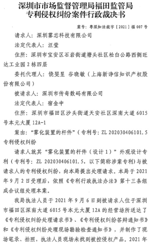 根据裁决书,悦刻认为,“波尔R4雾化杆”产品与涉案专利产品悦刻“幻影”雾化杆属于同一种商品,并且外观设计与悦刻幻影专利设计整体视觉效果上无实质性差异,落入专利权保护范围。