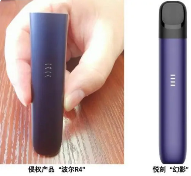 相关人士发现,“波尔R4雾化杆”产品外形酷似悦刻“幻影”雾化杆,仅在指示灯形状上和雾化杆底部弧度等细节处上有微小区别,不仔细观察,很难看出两者的差别。而悦刻早在2020年7月便向国家知识产权局提出悦刻“幻影”的外观设计专利申请,并由国家知识产权局于2021年3月授予专利并颁发证书,该专利真实有效,并受法律保护。
