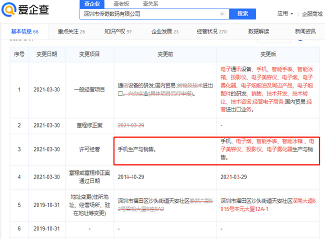 爱企查资料显示,波尔品牌母公司深圳市传奇数码公司注册于2005年,长期从事通信设备研发等业务。该公司于2021年3月变更增加了电子烟研发、销售等业务。