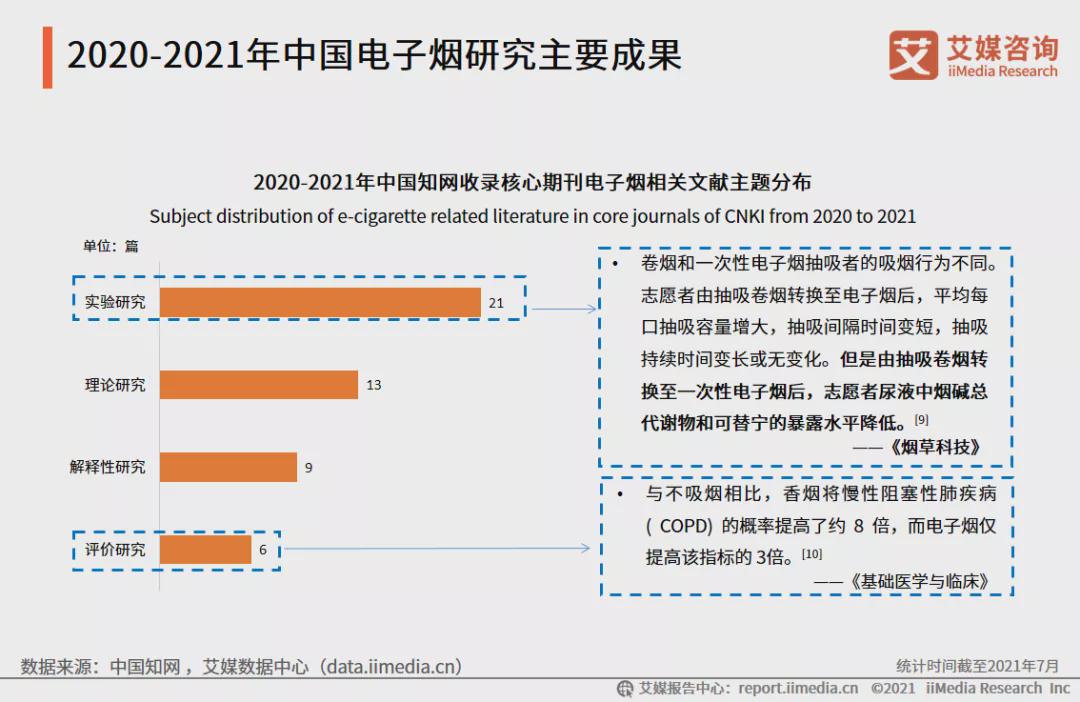 首当其冲的,是电子烟对于健康方面的影响。电子烟兴起之初,一个听起来似乎合理的“理论”就是:帮助戒烟。但实际上电子烟只是一种能够蒸发含尼古丁溶液的装置,市面上见到最多的是雾化型电子烟。电子烟不仅不能戒烟,内含有4大致癌物。世界卫生组织微信公众号发布的控烟文章,明确了含有尼古丁的电子烟对青少年的健康和发育会造成影响。数据显示,2020-2021年,我国核心期刊共收录关键词为“电子烟”的文献49篇。其中实验研究类文献篇目最多,达21篇,其次是理论研究与解释性研究,分别为13篇和9篇。尽管研究主题有所不同,但研究结论普遍认为,尽管使用电子烟仍对健康有害,但相对于直接使用卷烟而言,危害有所减小。