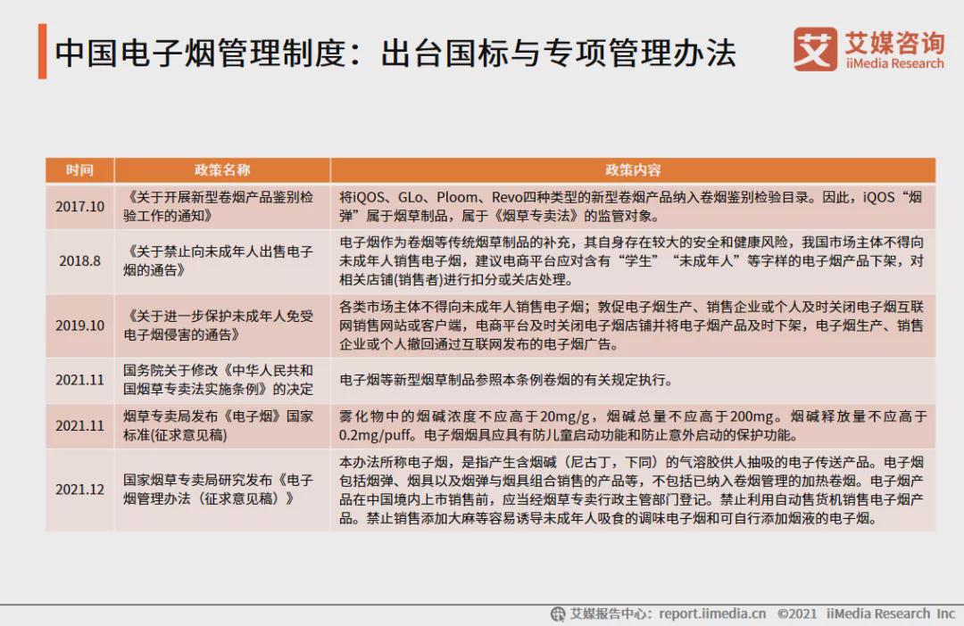 2021年下半年以来,国内电子烟的各种管理政策不断出炉,特别是12月份,国家烟草专卖局颁布《电子烟管理办法(征求意见稿)》,引发电子烟市场的极大震动。