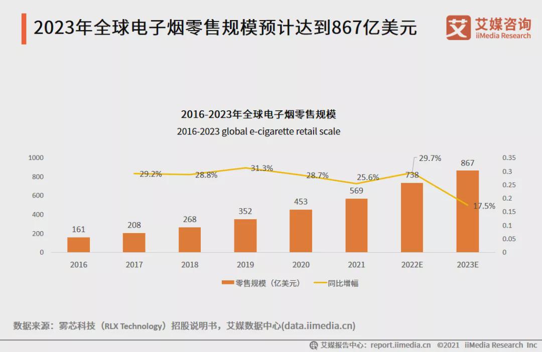 从2016年以来,全球电子烟火爆一时。市场数据显示,预计2023年全球电子烟零售规模将达到867亿美元。中国电子烟渗透率也从2013年的0.1%提升至2021年的2.2%,预计2023年中国电子烟市场规模将达到2952.7亿元。