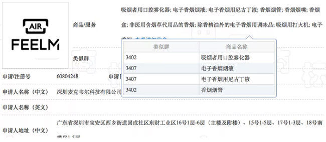 据国家知识产权局商标局中国商标网查询结果,近两个月思摩尔旗下麦克韦尔已申请“FEELM AIR”商标,据知情人透露,该商标将成为FEELM下一代陶瓷雾化技术的技术标识。
