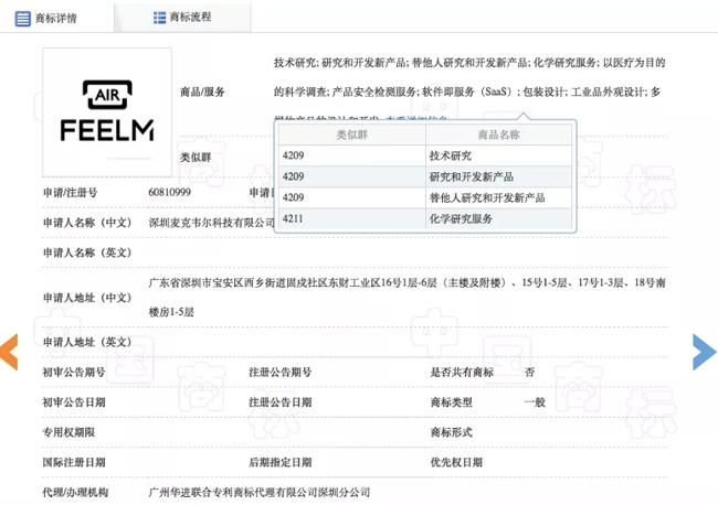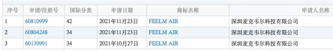 据中国商标网查询结果,麦克韦尔分别于2021年10月27日、11月23日连续申请国际注册号为60810999,60804248、60130991的“FEELM AIR”系列商标,覆盖34类和42类商标。
