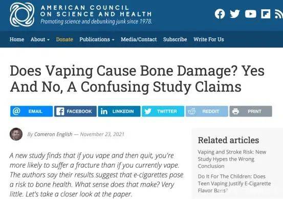 《电子烟会导致骨骼损伤?是与否,一项令人困惑的研究》,发布于ACSH官网 原来,一切问题都出在定义上。研究对电子烟用户的定义是“在过去30天内至少用过一次电子烟”。也就是说,无论是每天使用电子烟的重度用户,还是30天内仅尝试过一次就再也没用过电子烟的人,都叫电子烟用户。那这里是否包括前29天都抽卷烟,最后一天才开始用电子烟的“电子烟用户”?他们易骨折该怪卷烟还是电子烟? “作为研究前提的定义都不成立,结论自然毫无意义。”ACSH生命科学板块负责人、文章作者Cameron English犀利地说道。 再来看具体的研究内容。该研究发布于《美国医学开放杂志》,称对5500多名成人电子烟用户调查发现,使用电子烟与脆性骨折的患病率高相关。结论看起来很骇人,其中逻辑却漏洞重重:电子烟用户的脆性骨折患病率更高=电子烟用户更易骨折=电子烟用户骨质疏松=电子烟导致用户骨质疏松——典型的滑坡谬误。 骨折患病率高是否是因为用户从事危险工作?骨折患者除使用电子烟外,是否还有其他习惯共性?用户是否在使用电子烟之前就有骨折史?研究逻辑中的每个等号,都能被打上问号。 更致命的是,该研究的部分结论还与已被国际证实的权威科学结论相悖。 Cameron English表示,自己注意到这篇研究,是因为研究称“卷烟、电子烟双重用户的患病率比烟民的高”。英国公共卫生部早在2015年就证实电子烟能减去卷烟95%的危害,用户舍弃危害更大的卷烟,怎么患病率反而更高呢? 他去研读了这份研究,结果发现研究完全自相矛盾。数据显示,电子烟前用户的脆性骨折患病率比现用户的还高,按研究结论(电子烟是致病因素),停用电子烟应该不易骨折才对。