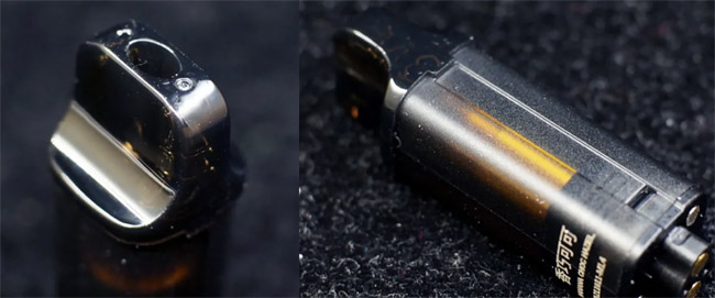 来到底部这里可以看到出厂的时候电极是凸出的,因为它使用的是棉芯,所以就用上了现在比较热门的油芯分离结构来保证口感体验。