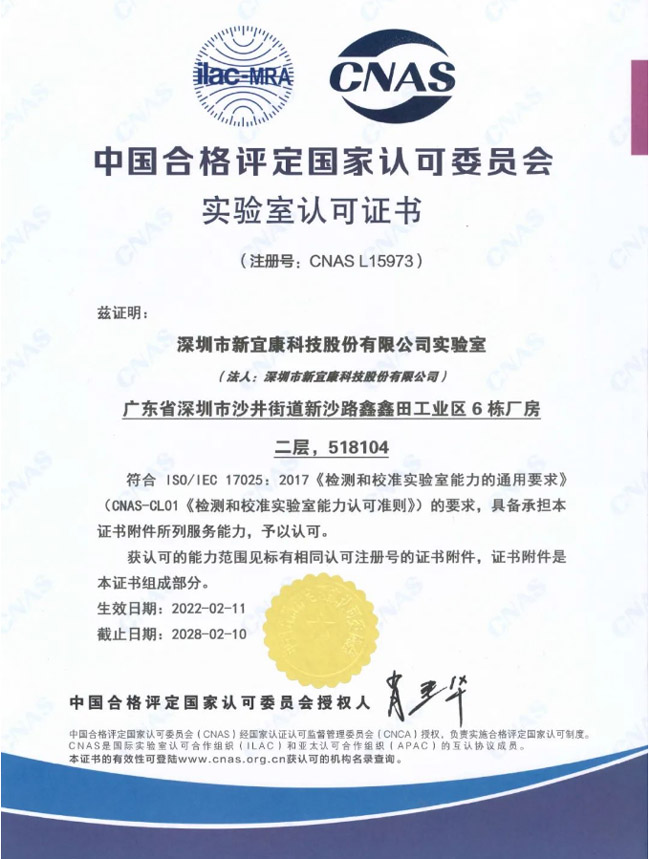 CNAS全称为中国合格评定国家认可委员会,它是根据《中华人民共和国认证认可条例》的规定,按照国际实验室认可合作组织(ILAC)、亚太实验室认可合作组织(APLAC)相关要求制定了实验室标准,是由国家认证认可监督管理委员会批准设立并授权的国家认可机构,负责对实验室等相关机构的认可工作。新宜康实验室能够获得CNAS认证,标志着新宜康实验室在硬件设施、管理水平和技术实力等方面步上新台阶。