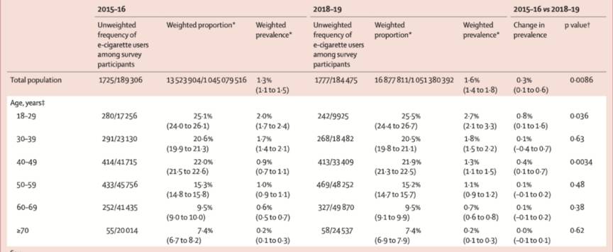 该研究标题为《中国成年人中的电子烟使用情况:2015-16和2018-19两年期反复横断面调查的结果》,旨在确定中国电子烟使用趋势及相关因素。