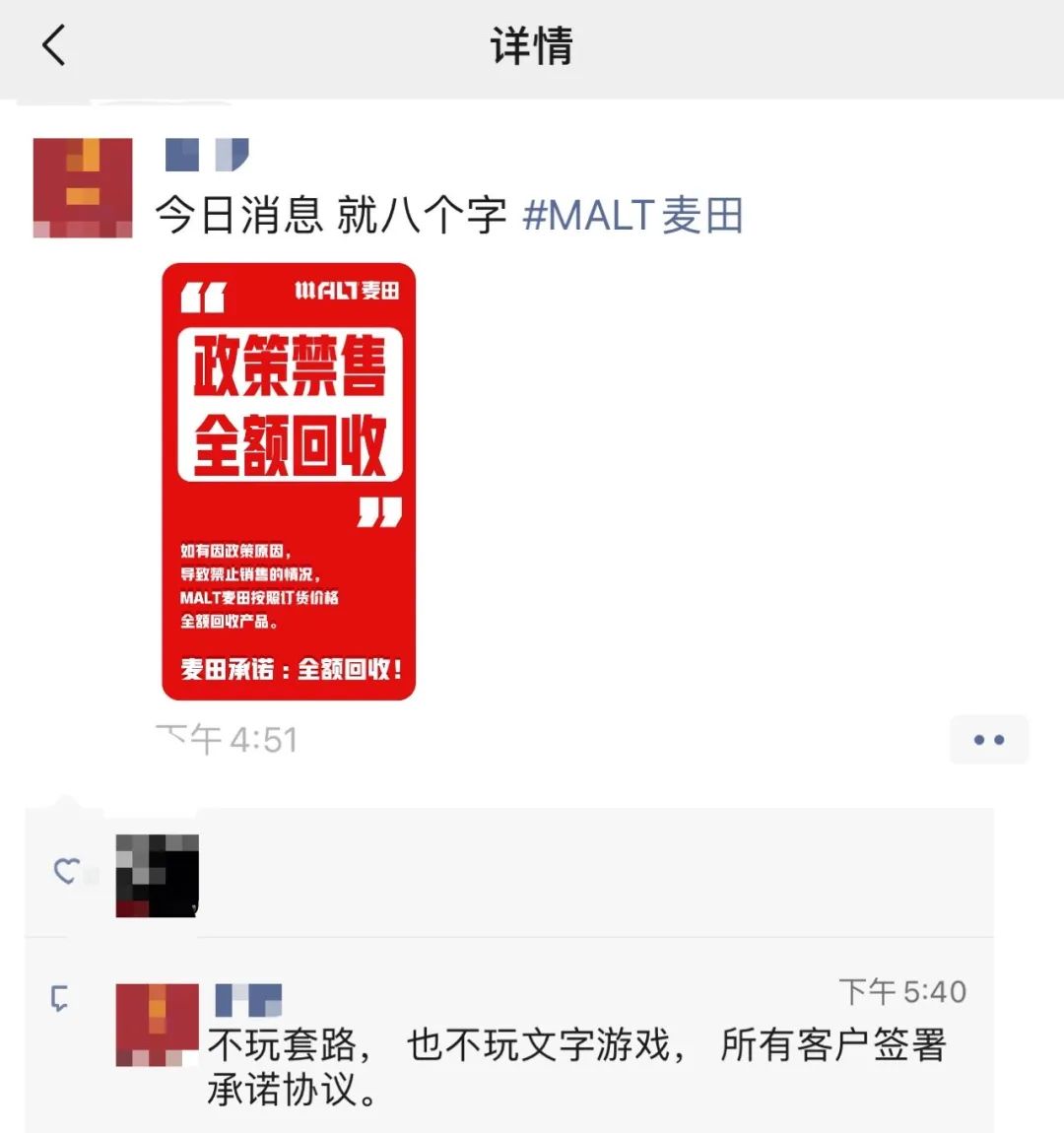 种种做法都能看出来麦田肯定憋了一个大招,果不其然,在今天下午五点多的时候,麦田赵总发布了一条朋友圈内容为:今日消息,就八个字(政策禁售,全额回收)并称不玩文字游戏,不玩套路,所有客户签署承诺协议。