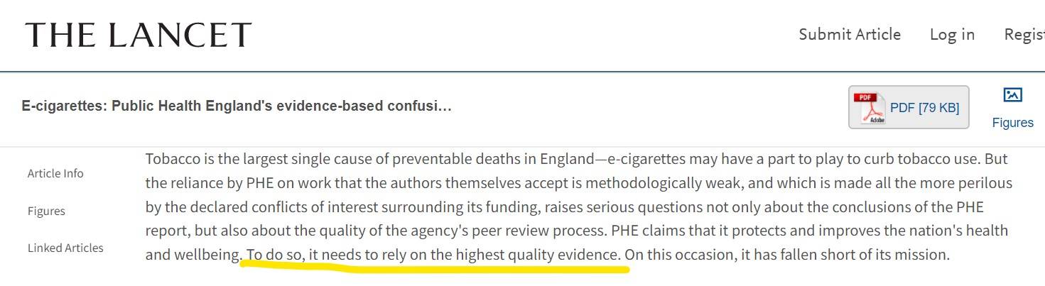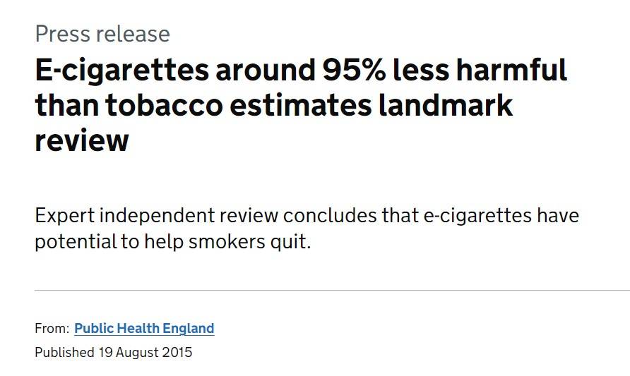 英国公共卫生部(PHE)委托的一项专家审查表明,在最理想的情况下,电子烟的危害比烟草低约 95%,有助于戒烟。这已是电子烟行业人手一份的「参考文献」。