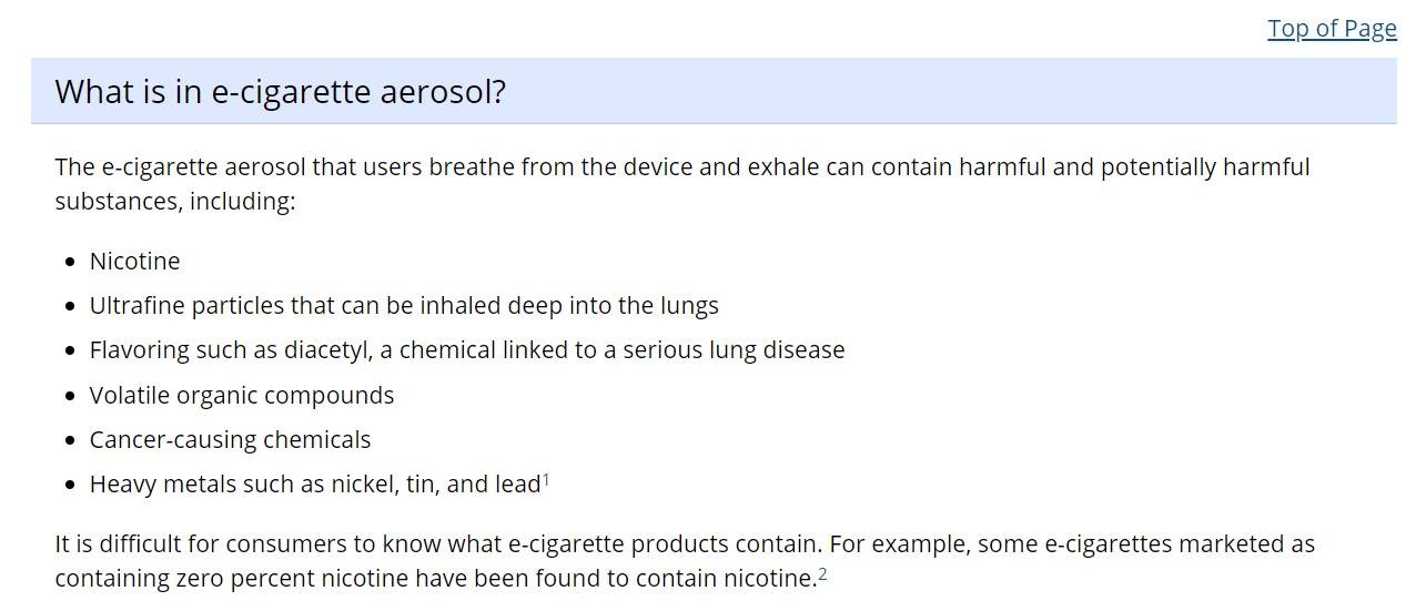 CDC 则在官网列明,除了尼古丁之外,电子烟气溶胶还可能含有致癌化学物质,挥发性有机化合物,可吸入肺部深处的超微粒子,与肺病相关的双乙酰调味剂,以及镍、锡、铅等重金属。