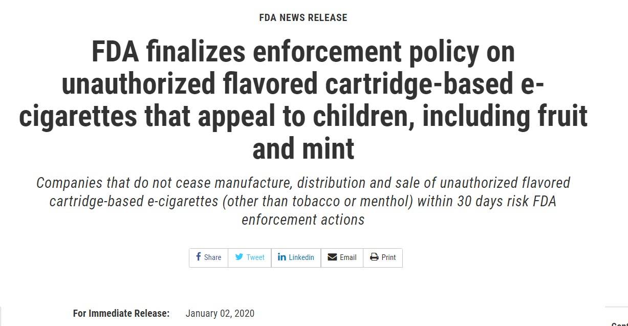 2020 年 1 月,美国食品药品监督管理局(FDA)发布美国电子烟新政,禁止烟草和薄荷醇以外的换弹式电子烟在市场上销售,从而「应对令人不安的青少年电子烟使用流行病」。