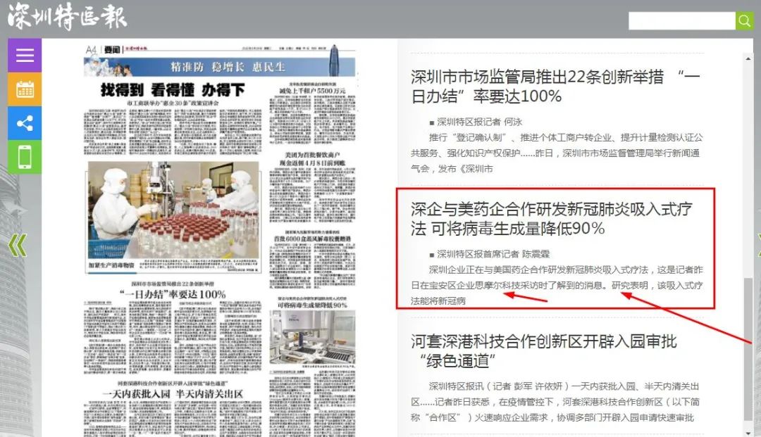 据报道,深圳宝安巨头企业思摩尔科技正在与美国药企合作研发新冠肺炎吸入式疗法。研究表明,该吸入式疗法能将新冠病毒传染性病毒生成量降低90%。思摩尔科技首席科学家及全球研发总监石志强表示,正与美国上市药企AIM保持密切合作,为其药物安普利近(Ampligen)提供安全雾化吸入装置,携手探索雾化技术在新冠肺炎治疗等医疗领域的应用。目前此合作已经进入到临床研究阶段。