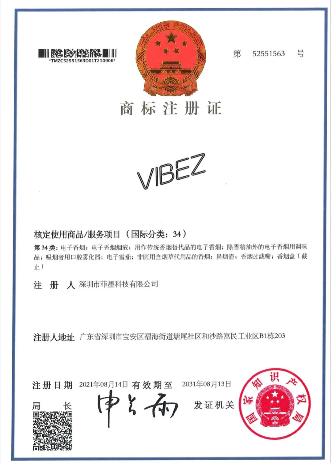 菲墨科技称,自己拥有VIBEZ商标权和相关产品的实用新型专利。
