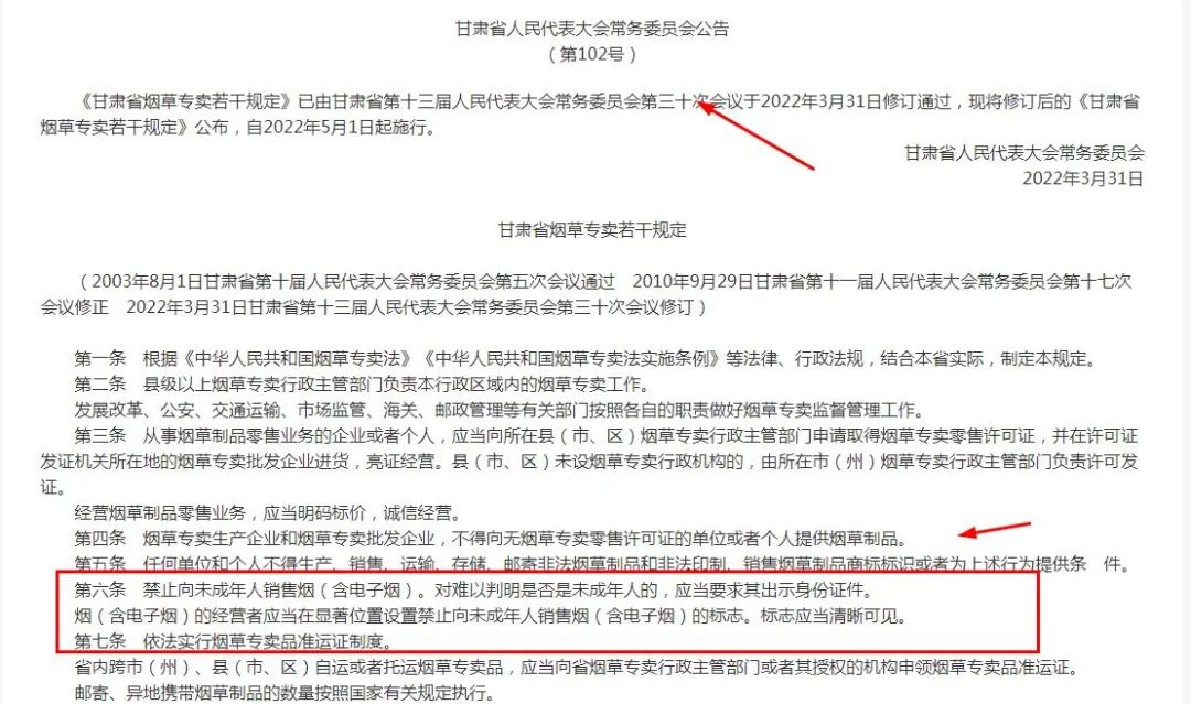 根据了解,甘肃省最早的一份烟草专卖若干规定是出自于2010年,到了2022年的3月31日再次修订,而且也是将于5月1日同步实施。