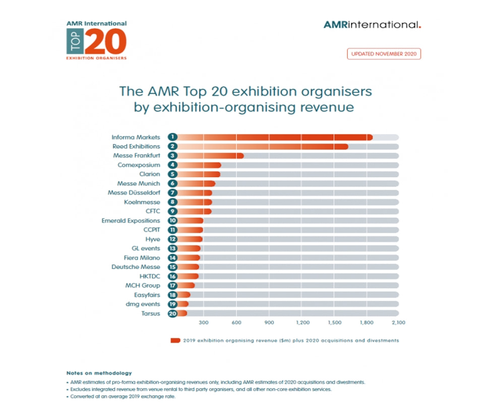 图为:2020全球范围内各展会主办机构的全年收入Informa Markets 位居前列