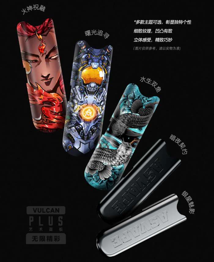 ASVAPE火神Plus采用磁吸艺术面板结构,两面均可快速拆装(Limitless LMC200的盒子也是可换面板的电子烟产品)。目前提供了火神祝融、曙光追寻、暗夜契约和银星魅影等5种主题的面板供您选择,细致纹理,凹凸有致,立体感受,精致巧妙。面板使用电镀不锈钢材质,淬炼光影镜面,再现卓越经典;锌合金塑造圆润机身,黑白双色,涂层细腻顺滑。