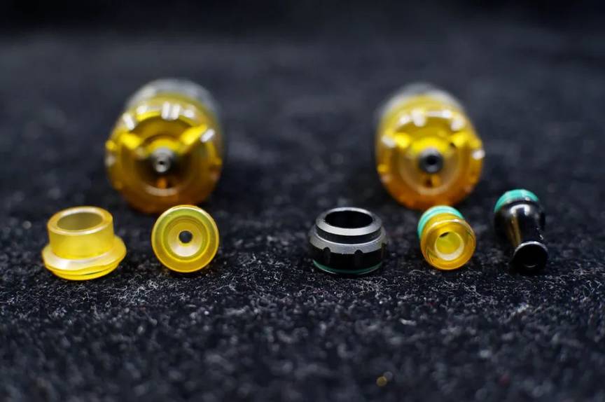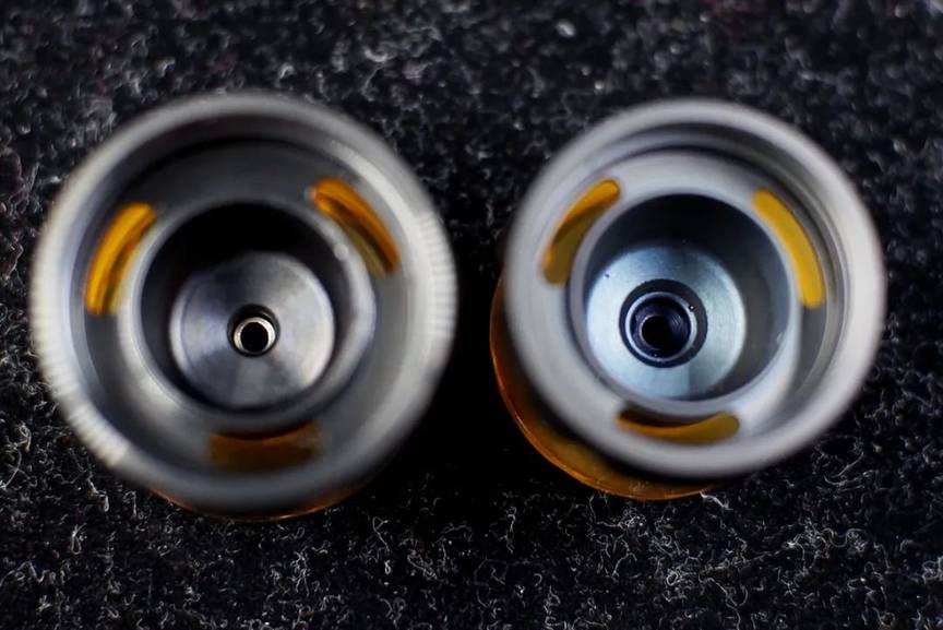 两个版本的顶部拆分后都是只有2个部件,只不过V2版改为了金属上盖。这里可以看到V1版的滴嘴中间孔径极其的小,感觉应该是想让气流吸入的时候更加的紧凑,显得其浓郁,但实际上所带来的却是超级憋屈的感受,与之进气匹配完全不搭调,加上挂冷凝的情况极其严重,实在搞不明白。而V2版的PEI短滴嘴与长滴嘴都比V1版的中央孔径要大,在无安装芯子的情况下稍微空吸一口,都比V1版舒服太多。