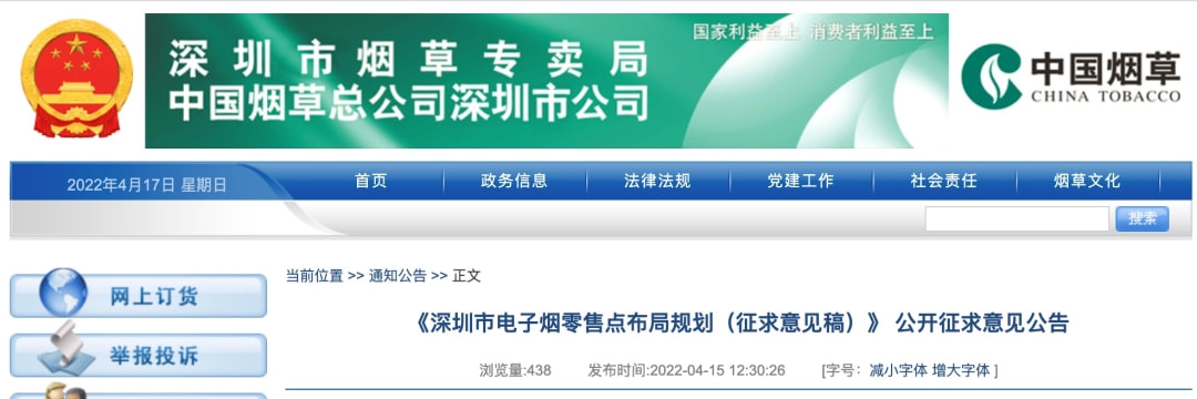 4月17日消息,蓝洞发现,深圳市烟草专卖局已经在15日发布了《深圳市电子烟零售点布局规划(征求意见稿)》 ,目前正在向公众征求意见(4月16日-4月26日),并将在5月17日召开现场听证会。