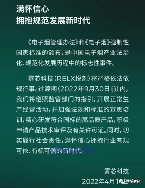 对此,雾芯科技表示,“《电子烟管理办法》和《电子烟》强制性国家标准的颁布,是中国电子烟产业法治化、规范化发展历程中的标志性事件。公司将严格依法依规行事。过渡期(2022年9月30日前)内,将遵照监管部门的指引,开展正常生产经营活动,并加强法规和标准的宣贯培训,精心研发符合国标的高品质产品,积极申请产品技术审评及有关许可证”。