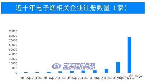 据《2021电子烟产业蓝皮书》数据显示,中国电子烟制造及品牌企业超过1500家,其中品牌企业有200家,电子烟供应链和周边服务企业有近10万家;零售门店近19万家。另据天眼查数据显示,目前我国电子烟相关企业14.8万家,其中仅2021年新增注册企业就高达7.7万家,同比大幅增长125.4%。