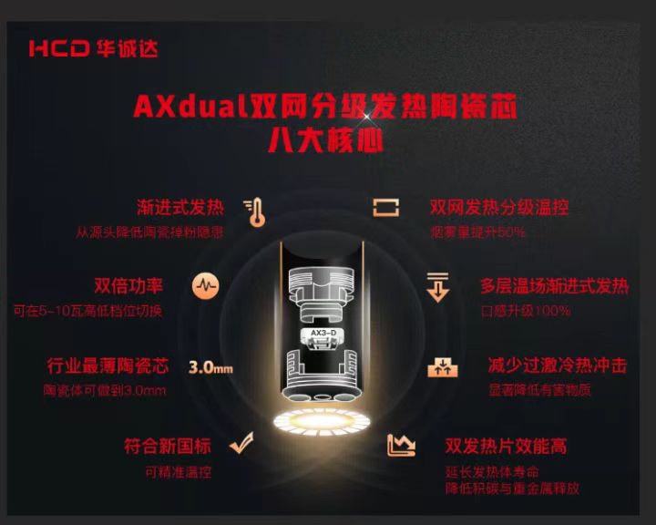 通过双网、分级发热,AXdual陶瓷芯最大限度解决了陶瓷芯的存在局部高温、掉粉、积碳、重金属释放、导油与漏油等痛点问题,分别进行了八大核心提升。