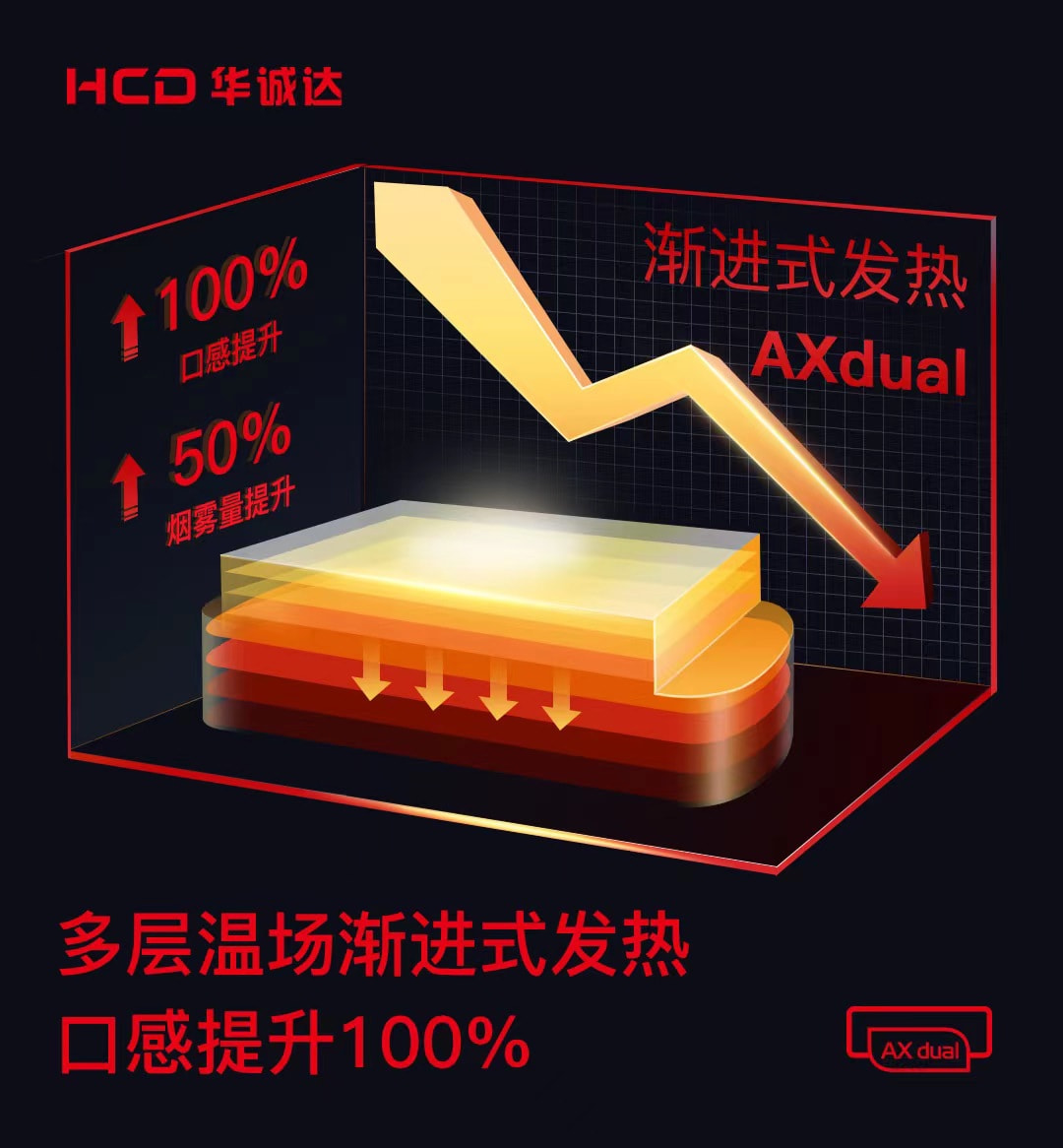 双发热片比单发热片发热效能更高,同等烟雾量下,发热片温度可适当下调,延长发热体寿命;同等口数下,降低积碳、糊味;降低重金属释放量。