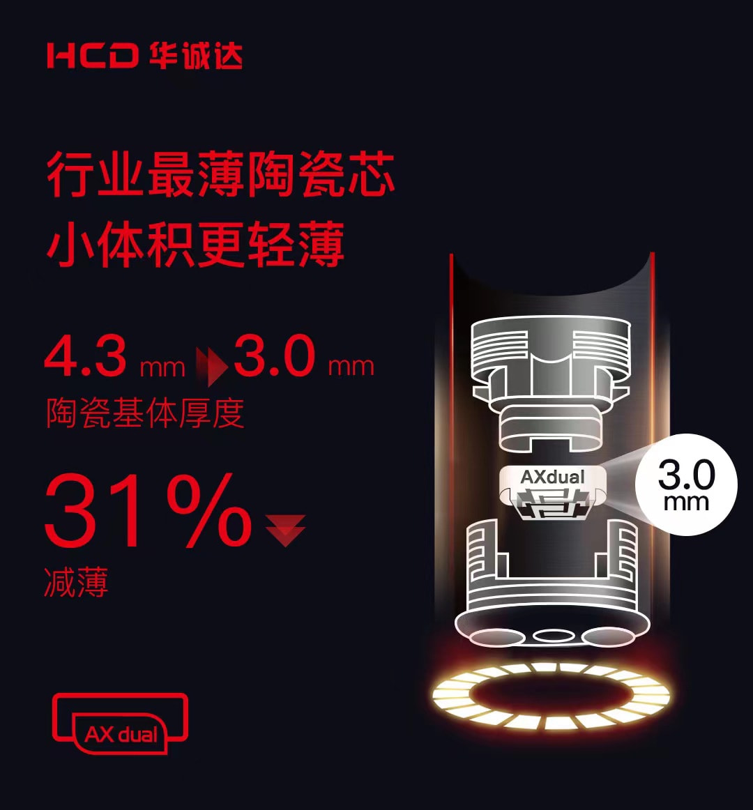 陶瓷厚度最薄可做到3.0mm,减薄31%,为目前行业最薄陶瓷芯,适合更小的装配空间,适合搭载更轻薄的雾化设备。