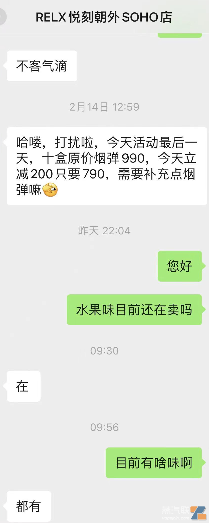 刘叶(化名)与悦刻电子烟门店工作人员的微信聊天截图