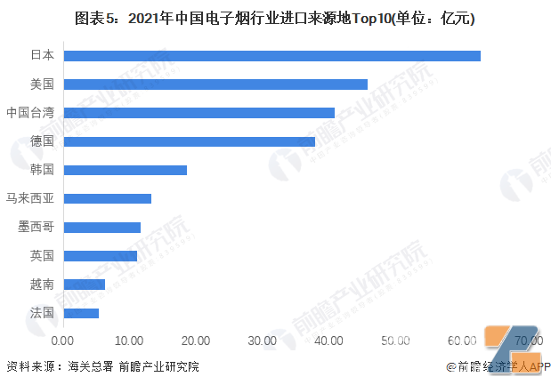 从中国电子烟行业的进口来源地角度来看,日本是我国电子烟行业的最大进口方,2021年全年我国从日本进口电子烟行业相关产品大62.56亿元。此外,我国从美国、中国台湾和德国进口电子烟行业相关产品的金额也都在35亿元以上。