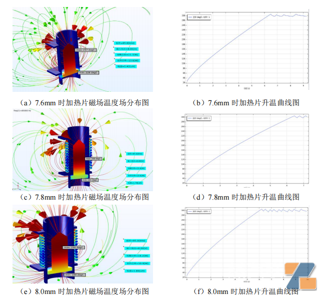 图 三种不同烟杯直径的加热片磁场温度场和升温曲线