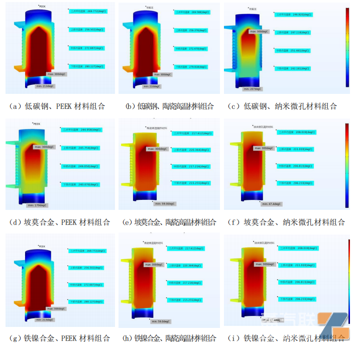 图 加热片采样点在300℃时,不同材料组合时温度场分布