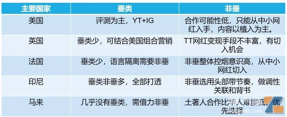 海外电子烟市场以美、英、法、印尼、马来五大国家为主,美国是电子烟头部国家,垂类网红资源丰富,喜欢评测新品,而非Vape网红对Vape接受意愿低,要求高,比较难合作,而英、发Vape类网红相对较少,非Vape也难合作,但是美国区域可以覆盖这2个区域的Vape受众。