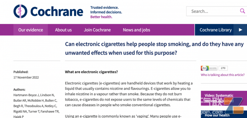 科克伦强调,其不确定对比尼古丁替代疗法、无戒烟解决方案支持或仅通过建议和咨询对比起来,使用尼古丁电子烟会产生的不良影响是否存在差异。