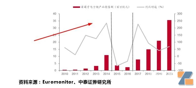 不过葡萄牙电子烟这些年友好些。2017年葡萄牙进行了税率修订,将电子烟消费税税率减半至每毫升0.30欧元,国内电子烟销售额在当年便翻倍,后续2018-2020年销售额增速处在40%-100%区间逐步增长。而2014年时候,葡萄牙将电子烟的消费税定为0.60 欧元/ml,然后2015 年市场暴跌,电子烟销售下跌66.5%。