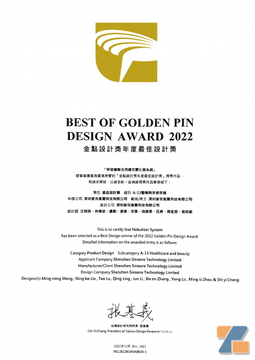 据了解,金点设计奖拥有40年历史,金点设计奖(Golden Pin Design Award) 是中国台湾最悠久、最权威、最具知名度的专业设计竞赛。被媒体称为「全球华人市场最顶尖设计奖项」 、「设计界的金马奖」。据主办方介绍,今年的金点设计奖及金点概念设计奖,共收到来自全球30个国家和地区、近8千件作品参赛,经初、复、决审三阶段评选,思摩尔的“呼吸机联合用网式雾化器系统”脱颖而出,一举拿下象征全球最高荣誉的“年度最佳设计奖”。
