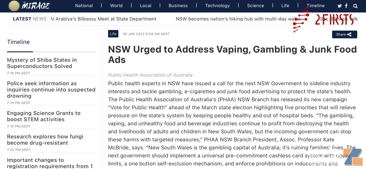 澳大利亚新南威尔士州公共卫生专家呼吁下一届新南威尔士州政府搁置行业利益,解决赌博、电子烟和垃圾食品广告问题,以保护该州的健康。