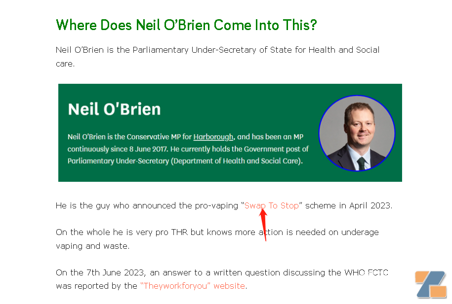 欧洲情报获悉,11月的《世界卫生组织烟草控制框架公约》第十次缔约方会议还没召开,已经有国家站出来表态。近日,英国卫生部部长尼尔·奥布莱恩(Neil O'Brien)告诉国会议员,英国代表团在世界卫生组织烟草控制框架公约(COP10)缔约方会议上,不会同意任何影响该国监管电子烟的决定。