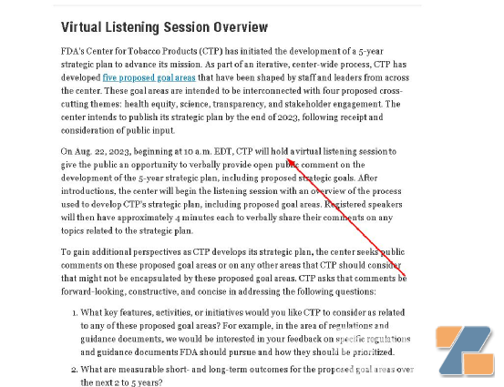 据美国食品药品监督管理局(FDA)官网公告,FDA烟草产品中心(CTP)将于美国东部时间2023年8月22日上午10点开始举行一场虚拟听证会,让公众有机会就 5 年战略计划的制定(包括拟议的战略目标)公开发表口头意见,注册的发言人每人将有大约4分钟的时间就与战略计划相关的任何主题发表口头意见。这些目标领域将与健康公平、科学、透明度和利益相关者参与等四个横向主题相互关联。该中心计划在2023年底前发布其战略计划,包括公众意见的收集和考虑。拟议目标领域如下:制定、推进和传达全面有效的烟草法规和指南;确保及时、明确、一致的产品审查以保护公共健康;通过强有力的执法措施确保受监管行业和烟草产品的合规;通过增进对烟草产品监管和使用风险的知识和理解来改善公共健康;不断提高运营卓越水平。
