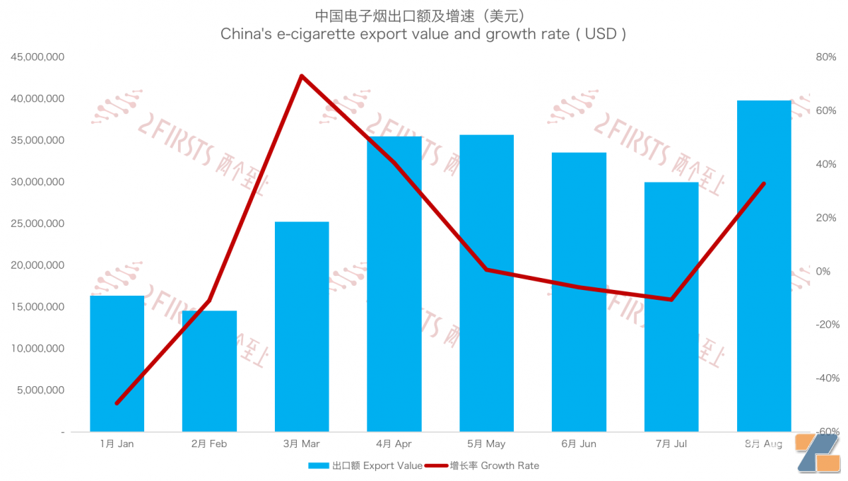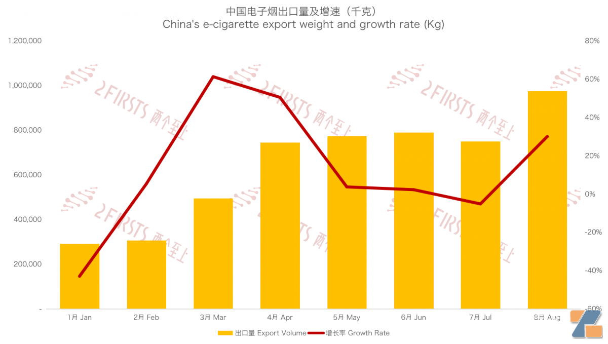 8月,中国出口荷兰电子烟总额3985万美元,环比增长32.76%,同比增长34.58%;出口量为976125千克,环比增长30.08%,同比增长162.12%。