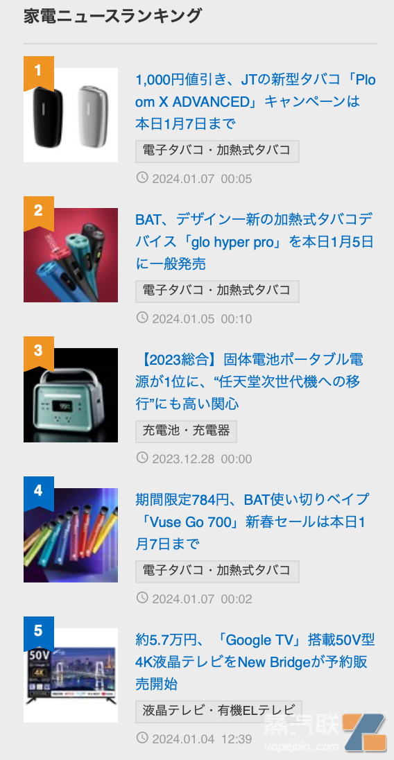日本购物网站的家电资讯类别下,新型烟草设备的资讯占了前五则中的三则|图源:购物网站截图