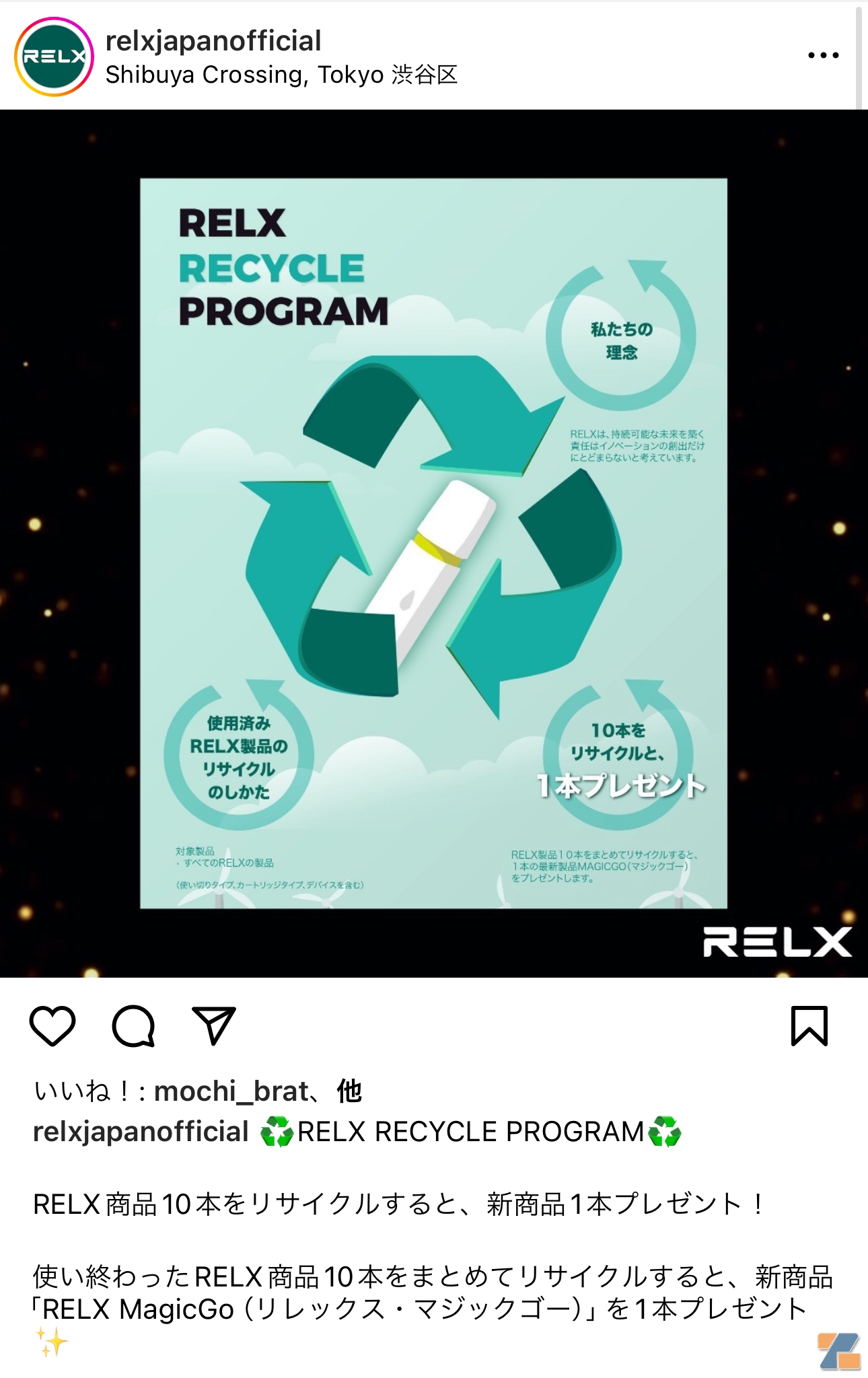 悦刻日本(RELX Japan)则是另外一例。在从一次性电子烟赛道上撬开这个市场时,悦刻不可谓不小心翼翼。除了在烟油上满足“零尼”的标准,还在社区积极开始了回收活动。在悦刻旗下零尼一次性产品RELX MagicGo 于2023年9月登陆日本后,悦刻日本紧跟着便在12月启动了全球首个一次性产品回收计划“RELX RECYCLE PROGRAM”。在12月28日至30日的第一阶段中,悦刻日本在福冈市中洲春吉桥桥上广场举办的美食活动“春吉桥串横丁”中的特设展位,将接受用完的RELX产品回收,并将在日后推出常设回收箱。消费者回收10个用完的RELX产品后,将获赠一支RELX MagicGo。