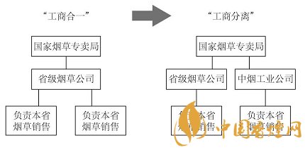 (上图有笔误,最后层级都写成销售了)工商分离前,烟草公司既管卷烟的生产,也管卷烟的销售,导致地方保护主义、地方封锁问题非常严重:在湖南买不到湖北的烟,在湖北买不到湖南的烟。3003年,国家局提出“改革工商管理体制,实行工商管理”的指示。工商分离后,省级烟草公司只负责本省烟草销售,由中烟工业公司负责本省烟草生产。
