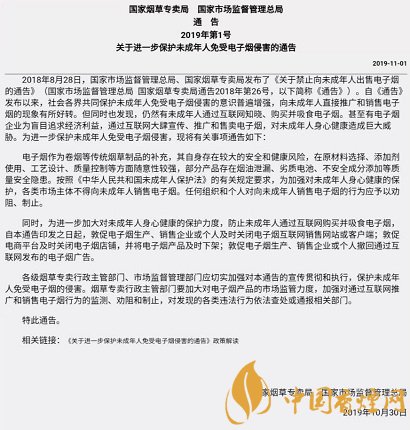 11月1日,国家烟草专卖局、国家市场监督管理总局发布《关于进一步保护未成年人免受电子烟侵害的通告》(网上称为“1号通告”,本文借用这一简称),多个互联网平台被约谈,电子烟的线上渠道基本肃清,并发的连锁反应,让电子烟行业陷入异常孤立的境地。